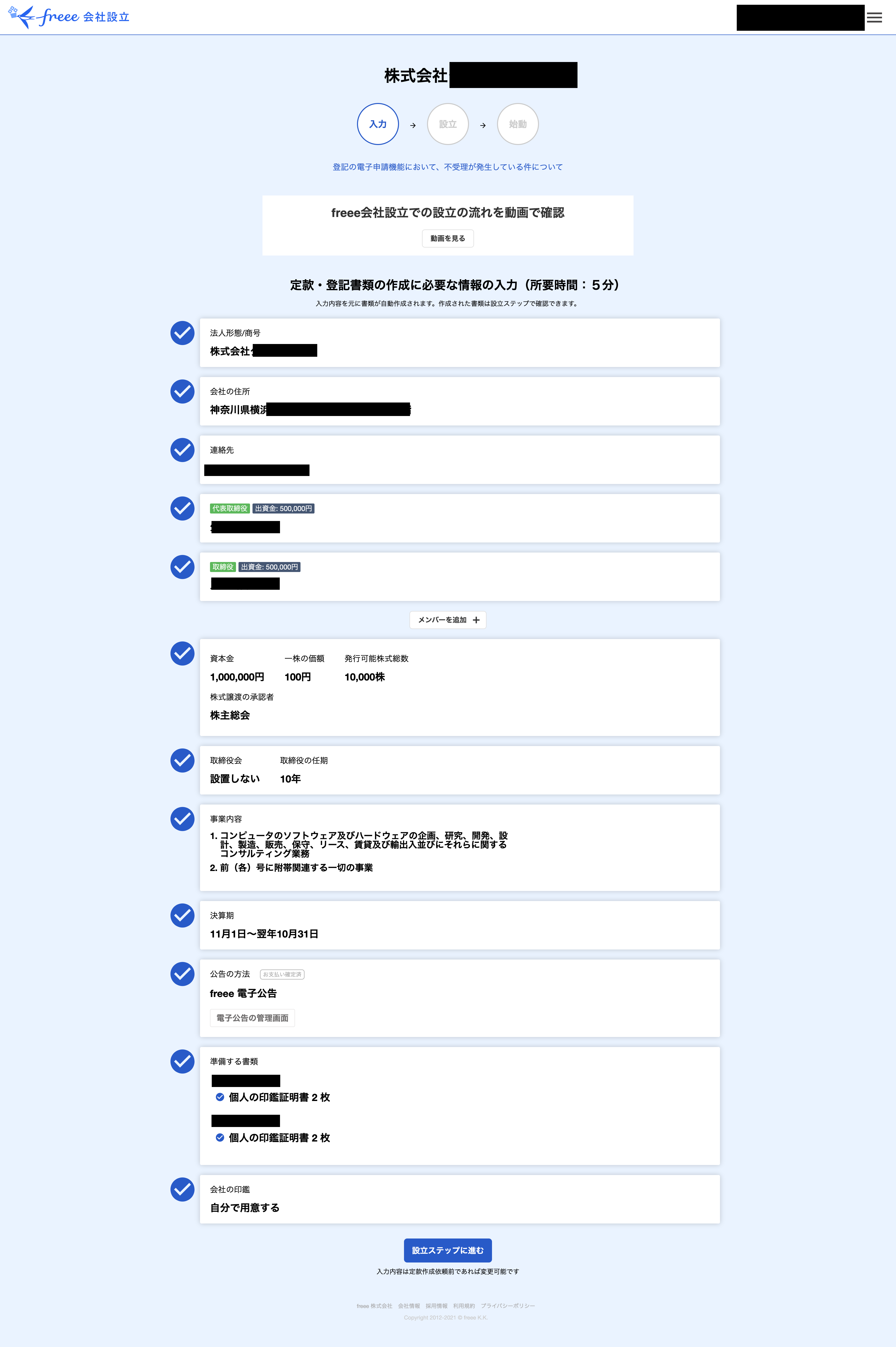 freee会社設立のスクショ