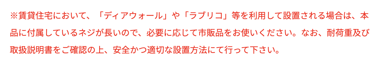 ってことはディアウォールやラブリコで設置できそうな気がするけど、ラブリコの商品ページやYouTubeを見ても、ネジ穴2つだけで設置できる感じがしない。