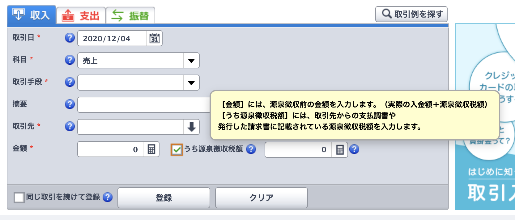- 源泉徴収:売り上げを登録する時にチェックを入れる