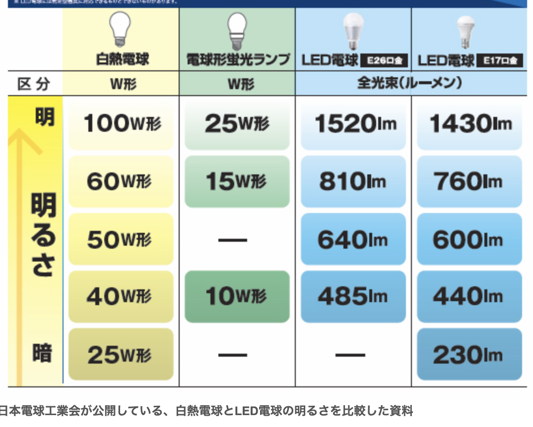 白熱電球はWで、LEDはlm(ルーメン)で明るさを表す